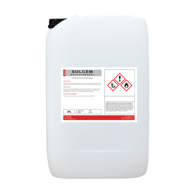 Solcure Super is a 90% Efficient Concrete Curing Compound which physically “locks” moisture into freshly cast concrete surfaces to allow full hydration of the cement thus allowing the concrete to fully “cure”. It does this by covering the surface of the concrete with a resin film that prevents moisture from leaving the surface. Solcure Super and its variants should not be used where bonding of any renders screeds or coatings is required, in these situations use Solcure WW or Solcure WWT.