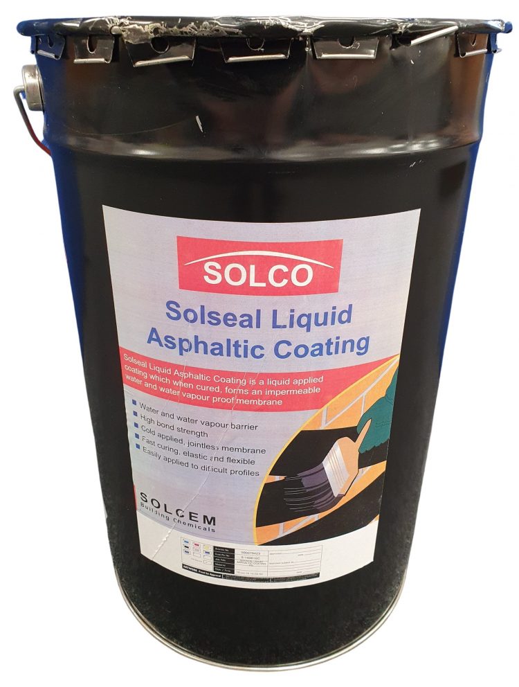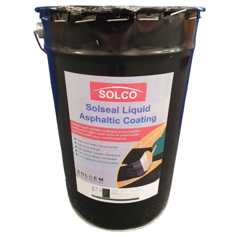 SOLSEAL Liquid Asphaltic Coating is a solvent based, full bodied black bitumen barrier coating. When dry, the product forms an odourless and taint free bitumen film suitable for the protection of above and below ground concrete, brickwork and blockwork.